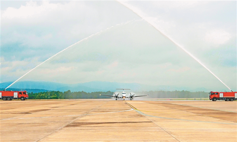 伴随着飞机的轰鸣声,命名为“林都号”的国王350飞机平稳降落林都伊春,缓缓驶向林都机场5号停机坪。当飞机落地脱离跑道后,左右两侧的消防车开始喷射水雾,两束水雾相互交错,以“水门礼”热烈欢迎乘坐“林都号”来伊春的游客。