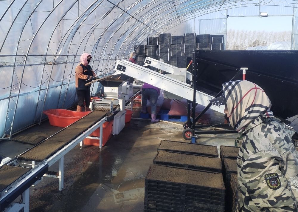 为更好地提升供给效率和增加种植户收入,建三江分公司积极推进双氧智能浸种催芽技术和暗室育秧技术全面提高秧苗质量,抢抓春播生产先机,为丰产丰收提供坚实保障。进入4月份以来,在智能双氧浸种催芽基地可以看到,技术人员正通过工厂化生产、臭氧消毒、智能化监控、标准化管理流水线的方式,全程机械化播种,保证装土一致,播种均匀,浇水透彻,覆土严密,再经过暗室设备调整适宜温湿度、出箱炼苗等多道程序,陆续摆入大棚。同时,为保证顺利孕育壮苗,分公司还在育秧前对各基地工作人员通过线上线下的方式统一组织技术培训,对暗室育秧技术操作规程进行指导,确保高标准、高效完成暗室育秧任务。