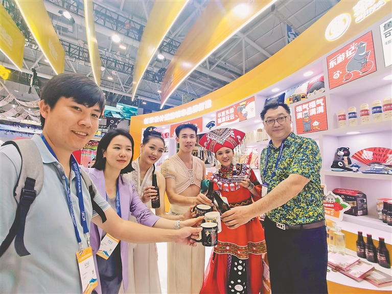 黑龙江抚远“蔓越莓”CEO(右)邀请广西“老友”品尝独具特色的蔓越莓啤酒。