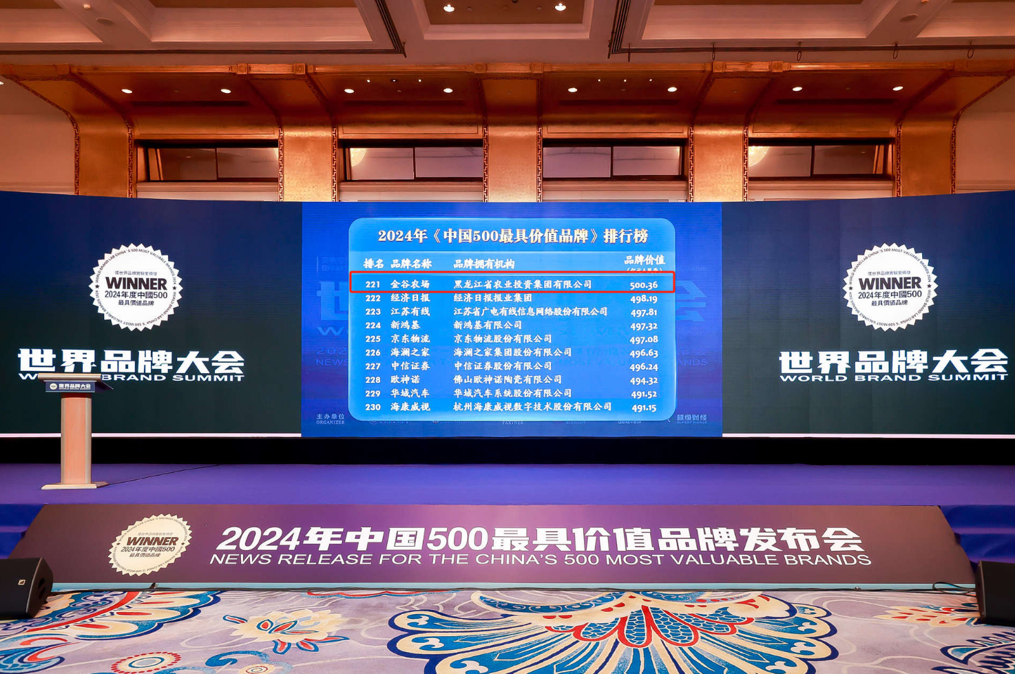 会上,发布了2024年《中国500最具价值品牌》分析报告。黑龙江省农业投资集团有限公司(以下简称“农投集团”)所属农投食品集团“金谷农场”品牌以500.36亿元品牌价值荣登《中国500最具价值品牌》排行榜第221位。农投集团党委书记、董事长常玉春代表农投集团领取奖杯和奖牌。