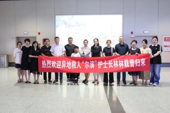 8月11日,外出休假的救人护士长林林回到哈尔滨,哈尔滨市红十字中心医院院领导班子以及部分职能科室负责人到哈尔滨太平国际机场迎接“救人英雄”林林“回家”。