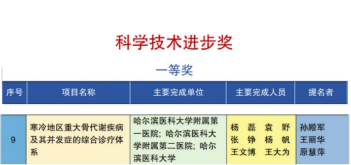 哈尔滨医科大学附属第一医院骨科杨磊教授团队荣获2023年度黑龙江省科学技术进步奖一等奖。