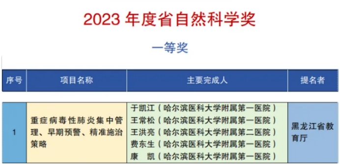 哈尔滨医科大学附属第一医院重症医学科于凯江教授团队荣获2023年度黑龙江省自然科学奖一等奖。