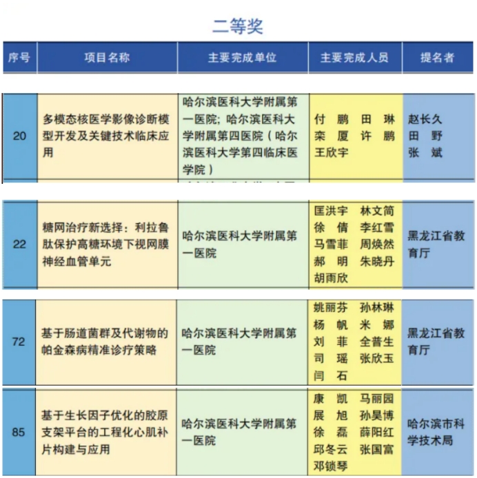 哈尔滨医科大学附属第一医院核医学科付鹏教授团队、内分泌科匡洪宇教授团队、神经内科姚丽芬教授团队、心脏大血管外科康凯教授团队获2023年度黑龙江省科学技术进步奖二等奖。