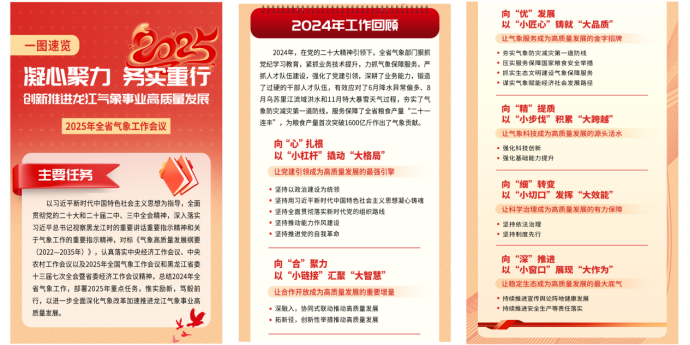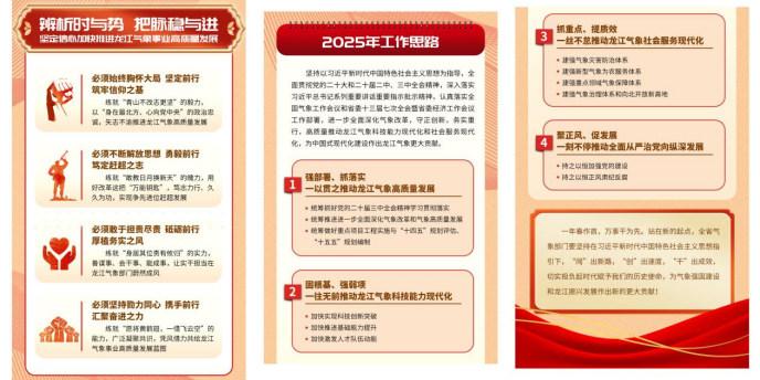 会议对2025年全省气象工作进行了部署。一是强部署、抓落实,将党的创新理论成果运用于黑龙江气象高质量发展的具体实践;统筹推进进一步全面深化气象改革和气象高质量发展,印发实施方案落实进一步全面深化气象改革举措,持续推进黑龙江气象高质量试点建设;统筹做好重点项目工程实施与“十四五”规划评估和“十五五”规划编制,推动黑龙江气象高质量发展。