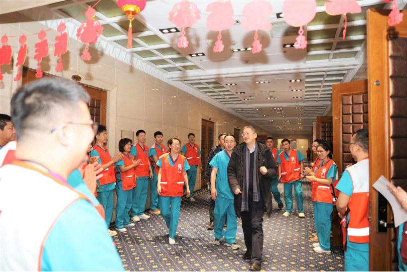 孙备向冰上项目运动员村诊所工作人员送上新春祝福。
