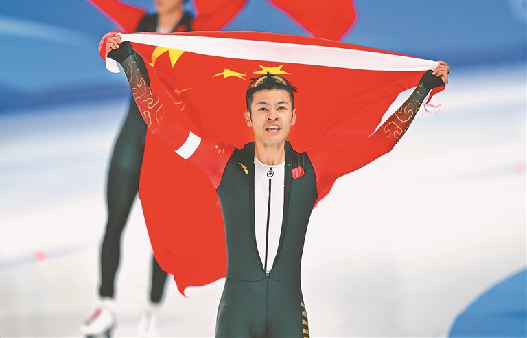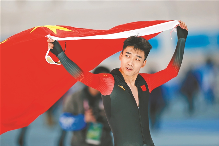 速度滑冰100米赛场上,高亭宇以9秒35的成绩打破亚洲纪录,斩获金牌。记者 郭俊峰摄