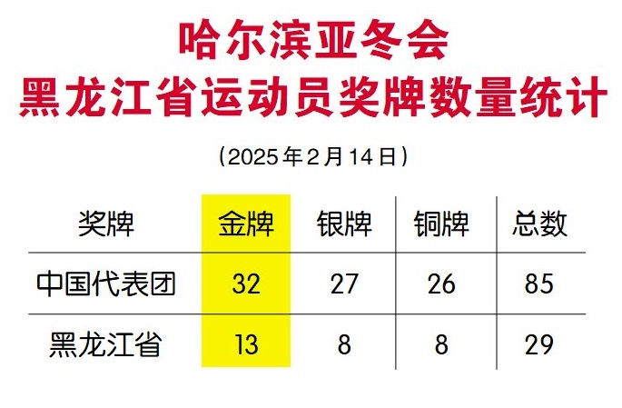 14日,第九届亚洲冬季运动会在哈尔滨落下帷幕,中国代表团取得32金27银26铜的佳绩,以绝对的优势雄踞奖牌榜首位。其中,黑龙江运动员共获得13金8银8铜(包括与其他省市运动员共同获得),作为冰雪运动大省再次作出应有的贡献。