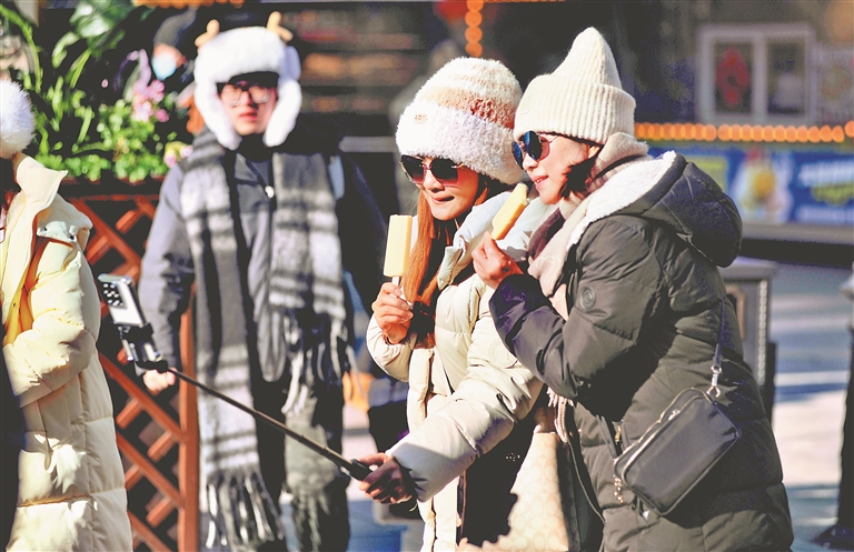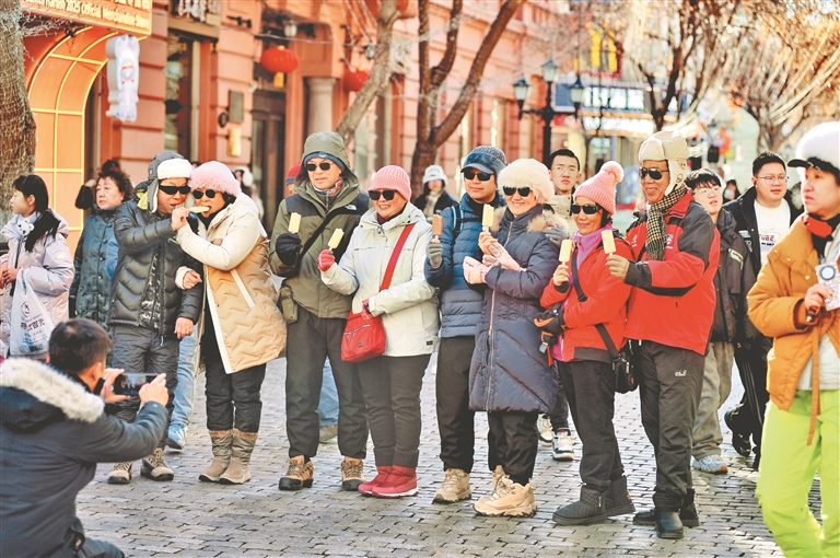 近日,哈尔滨市道里区中央大街、松花江畔等地,许多游客在观光游玩、品尝美食、打卡拍照。来自各地的旅行团一个接着一个,导游打着小旗在前面引导、讲解。春节过后,“尔滨”热度不减,亚冬会的举行为冰城旅游再添一把火,全国各地游客纷至沓来。(记者 苏强摄)