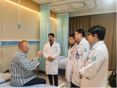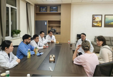 患者入住哈医大二院国际医疗中心,与哈医大二院国际医疗中心主任代建南(右3)及泌尿外科三病房副主任赵恩阳(右2),泌尿外科三病房尤泊森副主任医师进行交流。