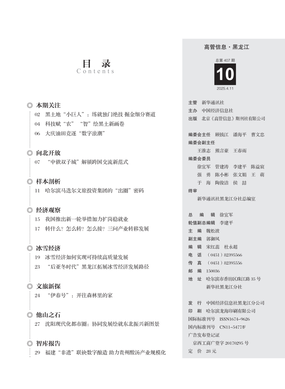 《高管信息》是新华社主管、中国经济信息社主办,具有国内统一刊号的经济信息期刊,主要刊登新华社记者采写的参考报道、决策信息,传达中央最新精神、解读最新方针政策,介绍各地各领域新成就、新经验以及遇到的新问题、新情况。《高管信息·黑龙江》紧紧围绕龙江各地党委政府中心工作,聚焦经济社会发展经验做法、问题困难、对策建议,为各级党政机关、企事业单位领导提供决策参考。