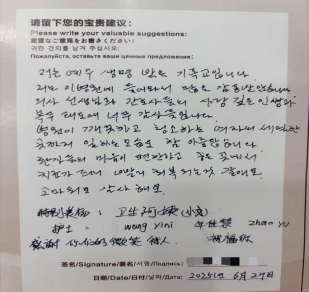 患者写下感谢信。