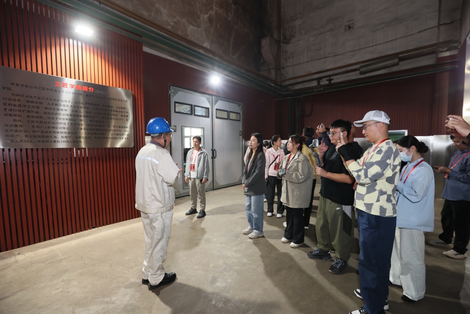随后,采访团走进学院“1+2”培训模式中的外延基地——焊接工艺实验室“焊接试验基地”和“职工基础技能培训基地”。三大基地实操总面积超2000平方米,功能覆盖主产品实训、新产品试验和基础技能培训。在焊接试验基地,王海向记者们介绍了新产品焊接工艺的研发与试验流程,展示了不同规格的焊接试板及检测标准。
