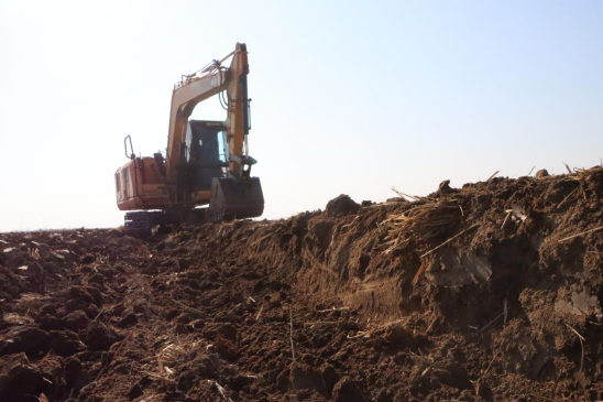 在名山农场莲花泡管理区水田地块,挖掘机正对池埂进行“削肥补瘦”式整型,通过调整埂体宽度、压实土层,确保“线直、埂实、面平”。莲花泡管理区技术员轩刚介绍说,这个时段是池埂取直的黄金期,土壤墒情合适,埂体压实经过一冬天更坚实,第二年不漏水。池埂取直后增加有效种植面积,也能为种植户省工省力,提升土地利用率。