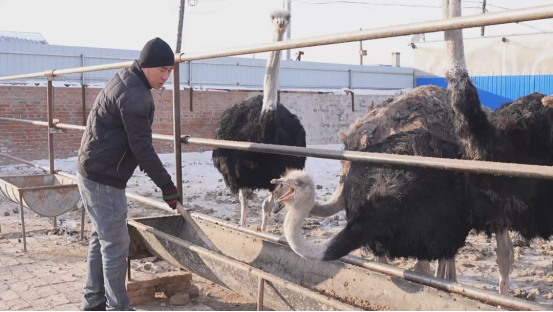 2023年,孙士财考察发现鸵鸟耐粗饲、抗病力强,在北方严寒天气下无需特殊保温设施,养殖成本较传统畜禽低三成以上,遂引进40只鸵鸟试养。凭借精心照料,鸵鸟长势喜人,他还于今年春天成功孵化30多只雏鸟,直接增收2万元。
