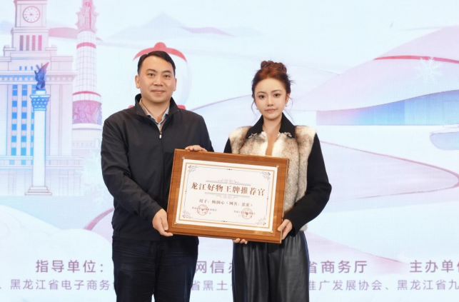 活动现场,黑龙江省工商联专职副主席、省总商会副会长马辉为杨润心颁发了“龙江好物王牌推荐官”荣誉证书。