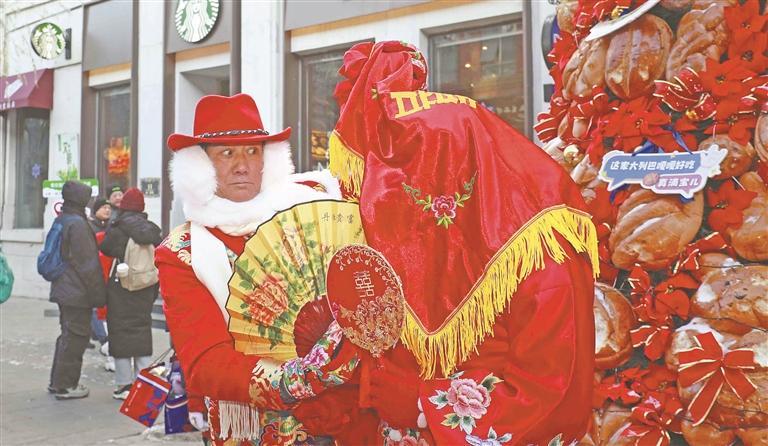 近日,在哈尔滨市道外区中华巴洛克历史文化街区,黑龙江省文旅厅主办的“龙江冰雪游”巡游活动吸引了众多游客参与其中。现场互动热闹非凡,各地游客争相与“冰雪公主”合影,有的还即兴加入秧歌队伍扭起大秧歌。年轻情侣主动扮演“新郎”“新娘”角色,在演员指导下完成传统婚俗体验。孩子们则围着腰鼓队学习鼓点打法,欢声笑语与锣鼓声交织,将冬日老街变成欢乐的海洋。(记者 张澍摄)