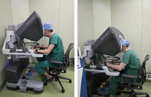 王贵玉(左)和耿波(右)分别操作达芬奇机器人手术