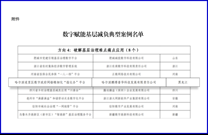 近日,工业和信息化部正式公布《关于公布数字赋能基层减负典型案例名单的通知》,经地方推荐、专家评审、网上公示等严格环节,全国共28个案例脱颖而出。由哈尔滨鹏博普华科技发展有限责任公司(以下简称鹏博集团)自主研发的哈尔滨道里区数字政府网格精细化“指尖办”平台成功入选,成为黑龙江省唯一上榜案例。这一成果不仅为龙江基层治理数字化打造了实践标杆,更彰显出我省以数字技术赋能基层治理的显著成效,也是黑龙江省工信厅深耕软件行业培育、以数字技术赋能千行百业的生动实践。